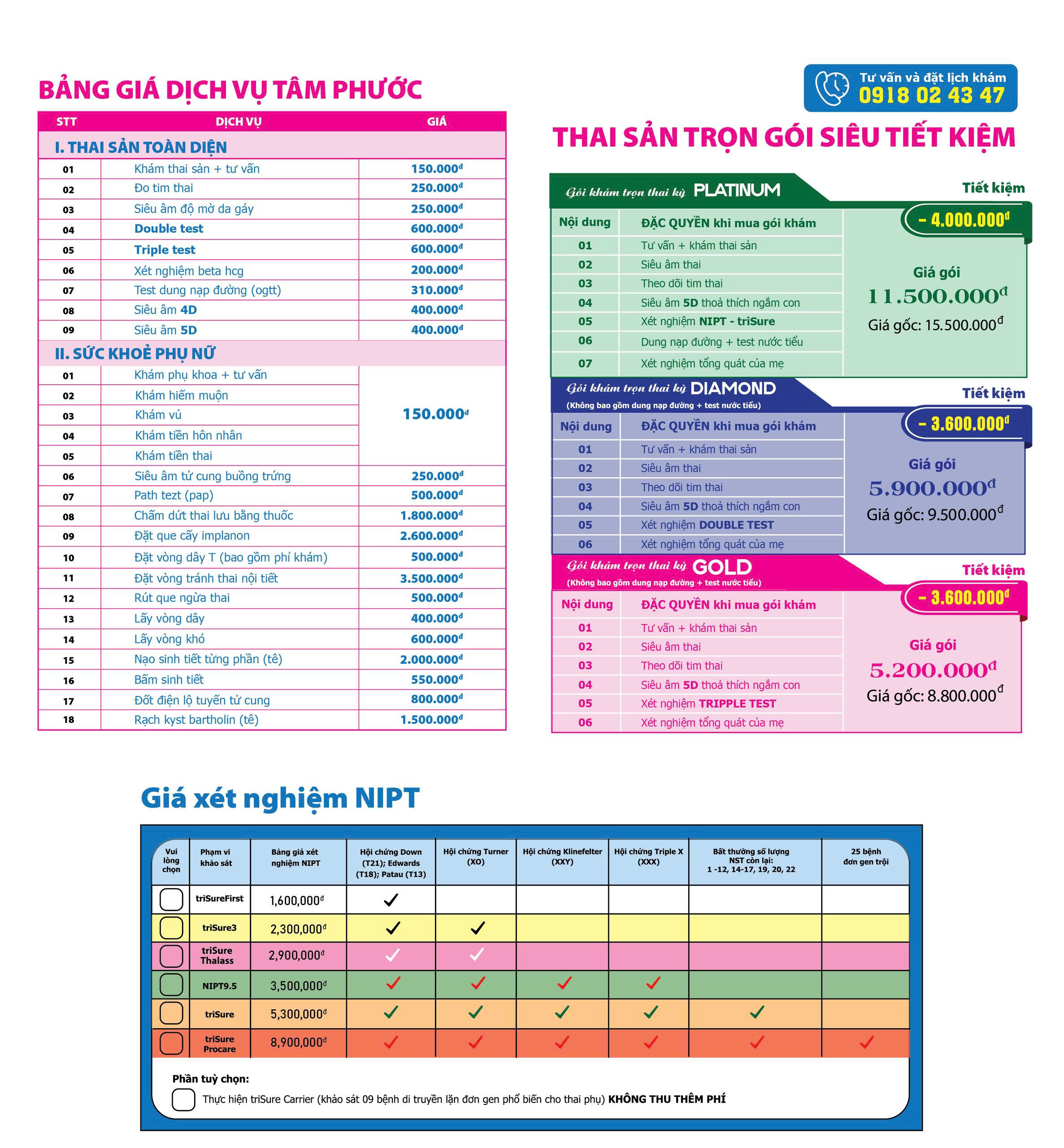 Để có một thai kỳ khỏe mạnh và được chăm sóc sức khỏe toàn diện, gói khám Trọn thai kỳ - VIP tại Phụ sản Tâm Phước luôn được nhiều phụ nữ chọn lựa. Với gói khám Trọn thai kỳ - VIP của chúng tôi, các mẹ bầu sẽ được trải nghiệm các dịch vụ bao gồm: